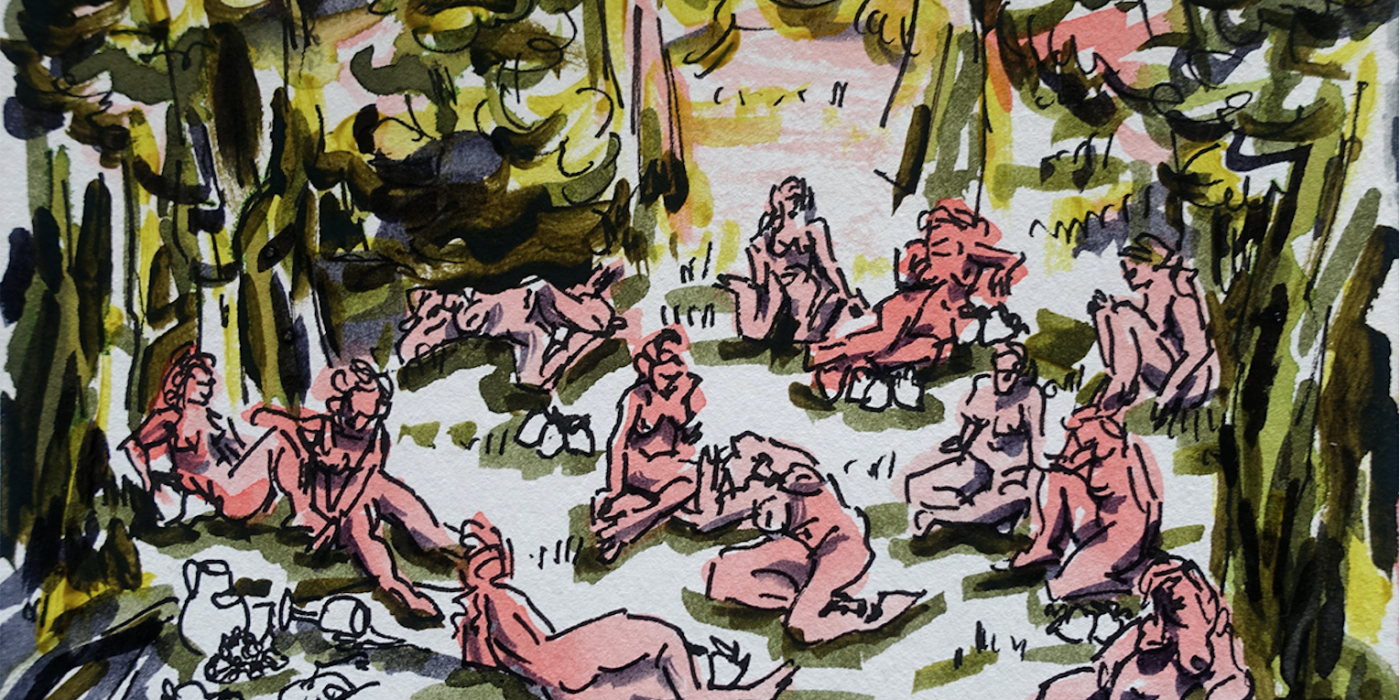 Eine Ausstellung zum Internationalen Frauentag am 8. März 2021 zum Thema „Gleichstellung von Frauen im Jahr 2021“. Kulturverein Schloss Eulenbroich in Rösrath. Ausstellungsdauer: 8. – 15. März 2021. Abbildung: Das Frühstück im Grünen, 2021, Tusche und Aquarell auf Büttenpapier, 10,5 x 15 cm.